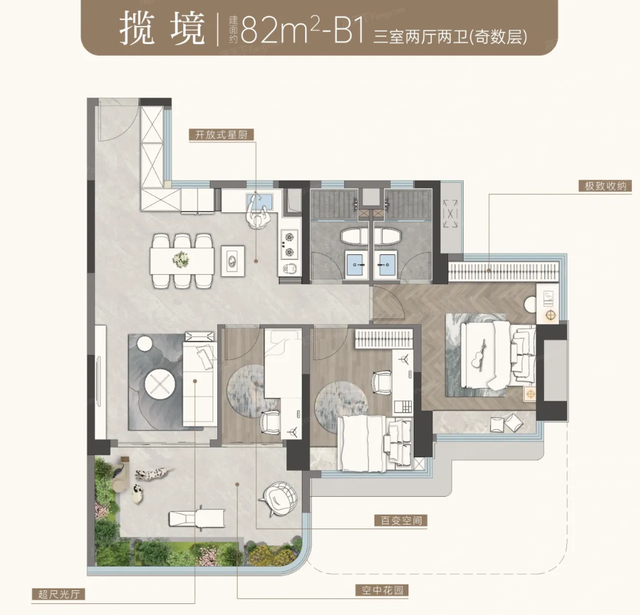 建面82㎡三房两卫